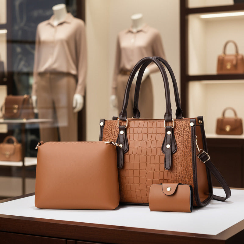 Set 3 Cartera Y Bolso De Mano Mujer Eco Cuero Dama Elegante Marrón Lisa Negro